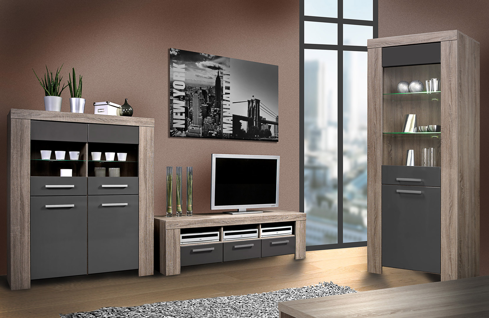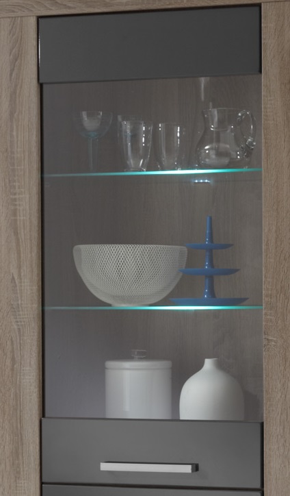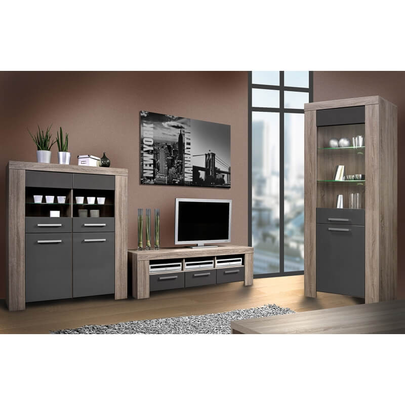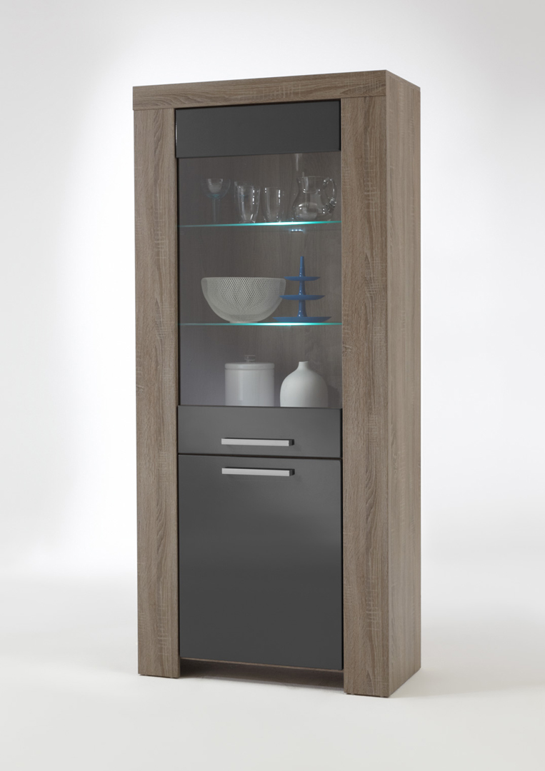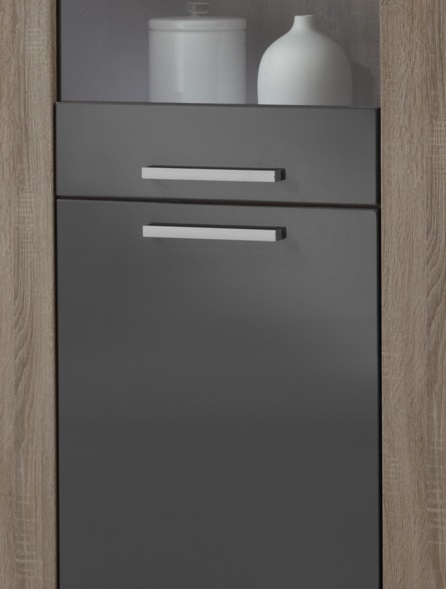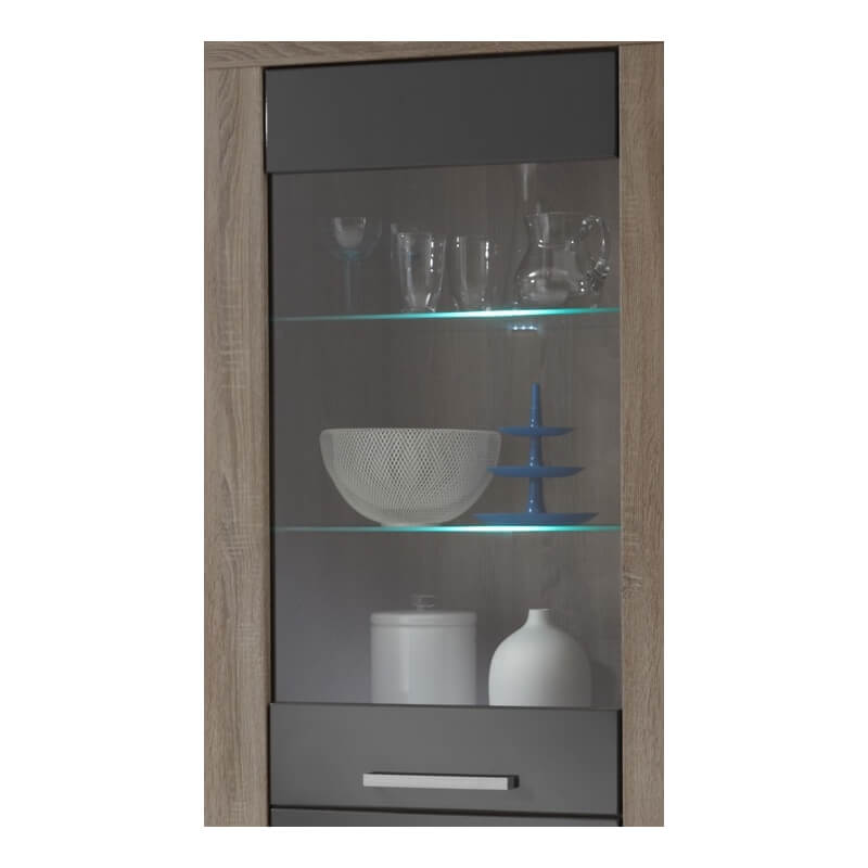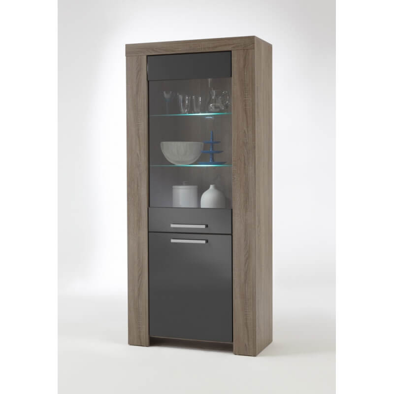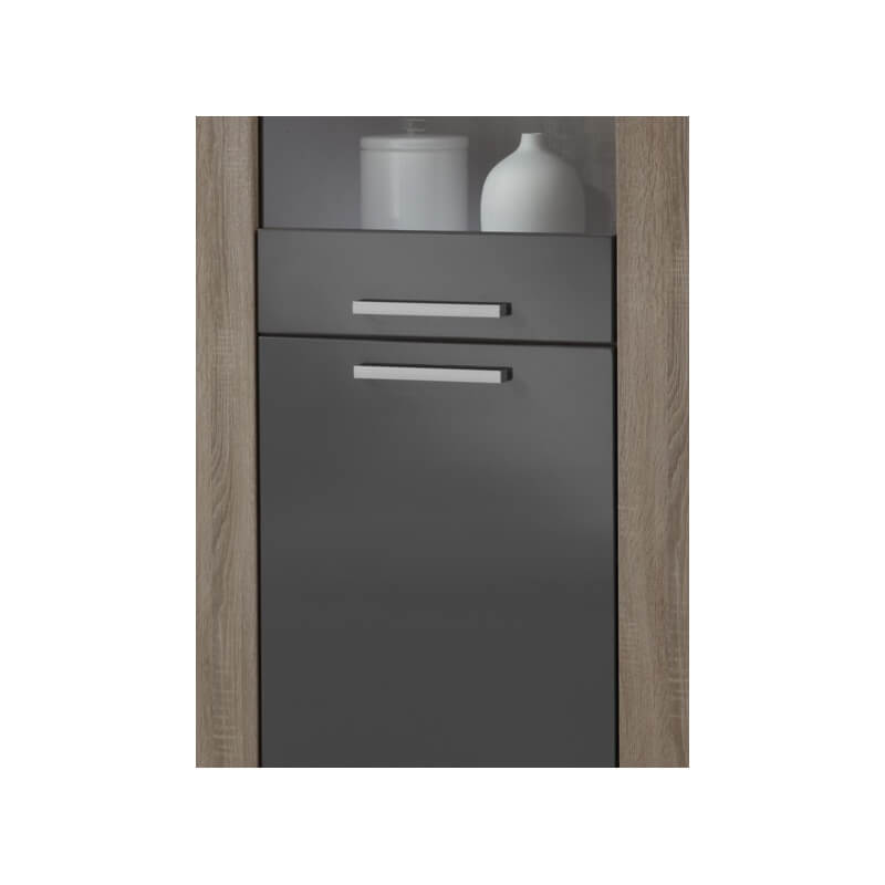 Mélange parfait entre le chêne truffe et le gris laqué, la vitrine contemporaine Loise trouvera facilement sa place au sein de nombreux intérieurs. Sa structure est fabriquée en panneaux de particules de haute qualité. Les façades en MDF sont recouvertes d'une laque grise anti-rayures. Elle se compose d'une porte vitrée comprenant 2 étagères en verre avec éclairage et d'une porte pleine comprenant 1 étagère intérieure. Pour un ensemble harmonieux, optez également pour les autres éléments de la gamme Loise vendus séparément.