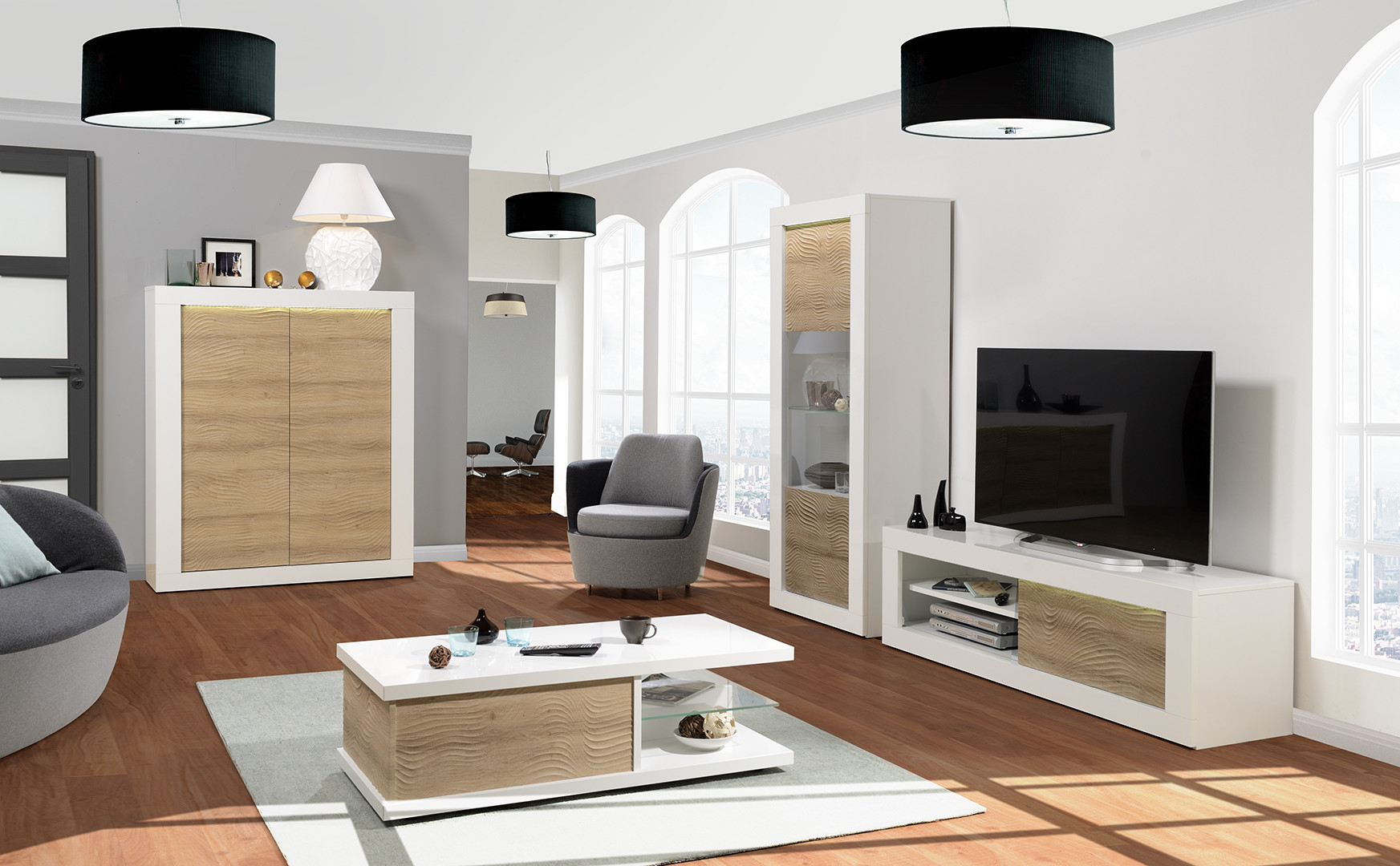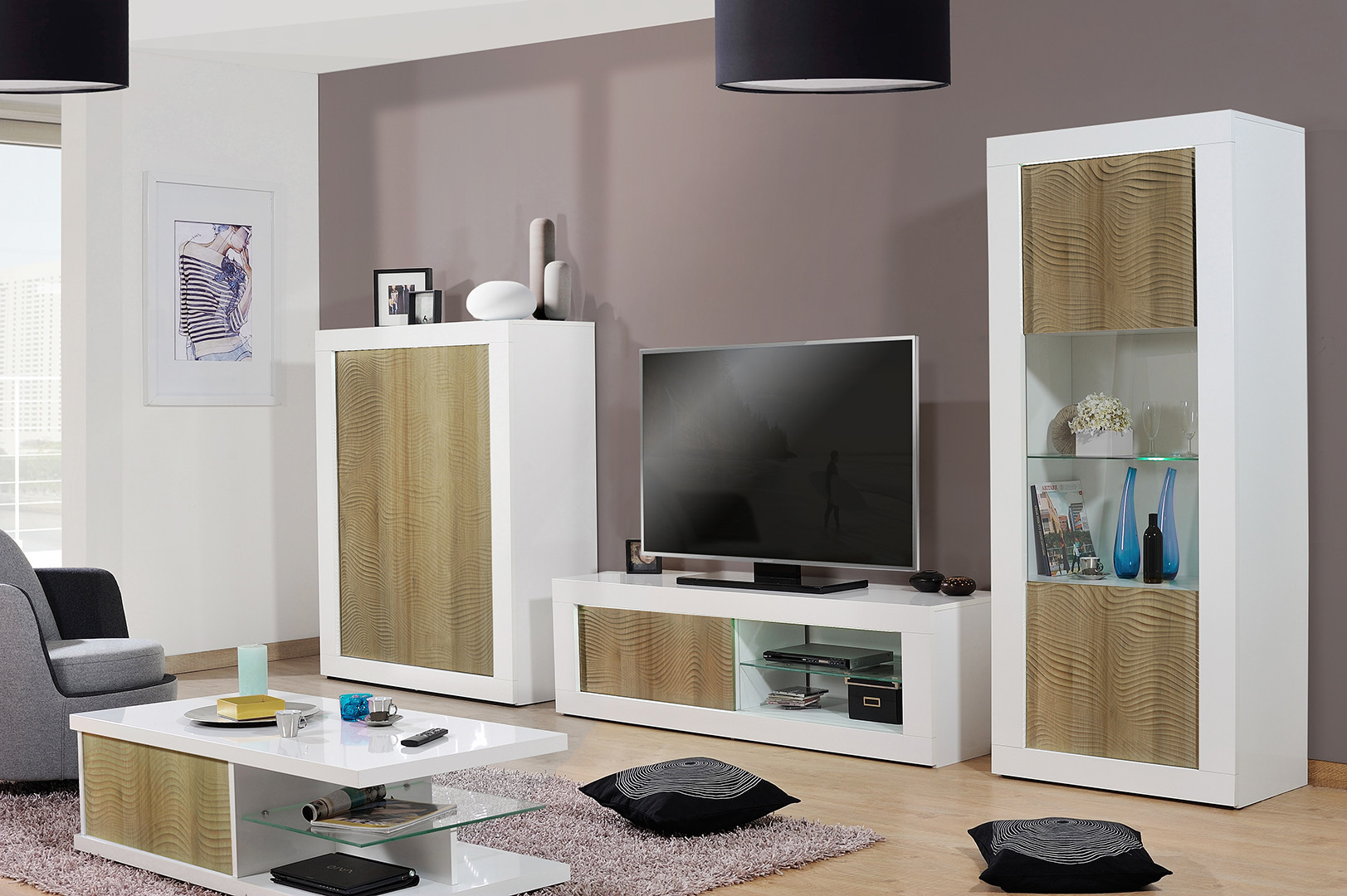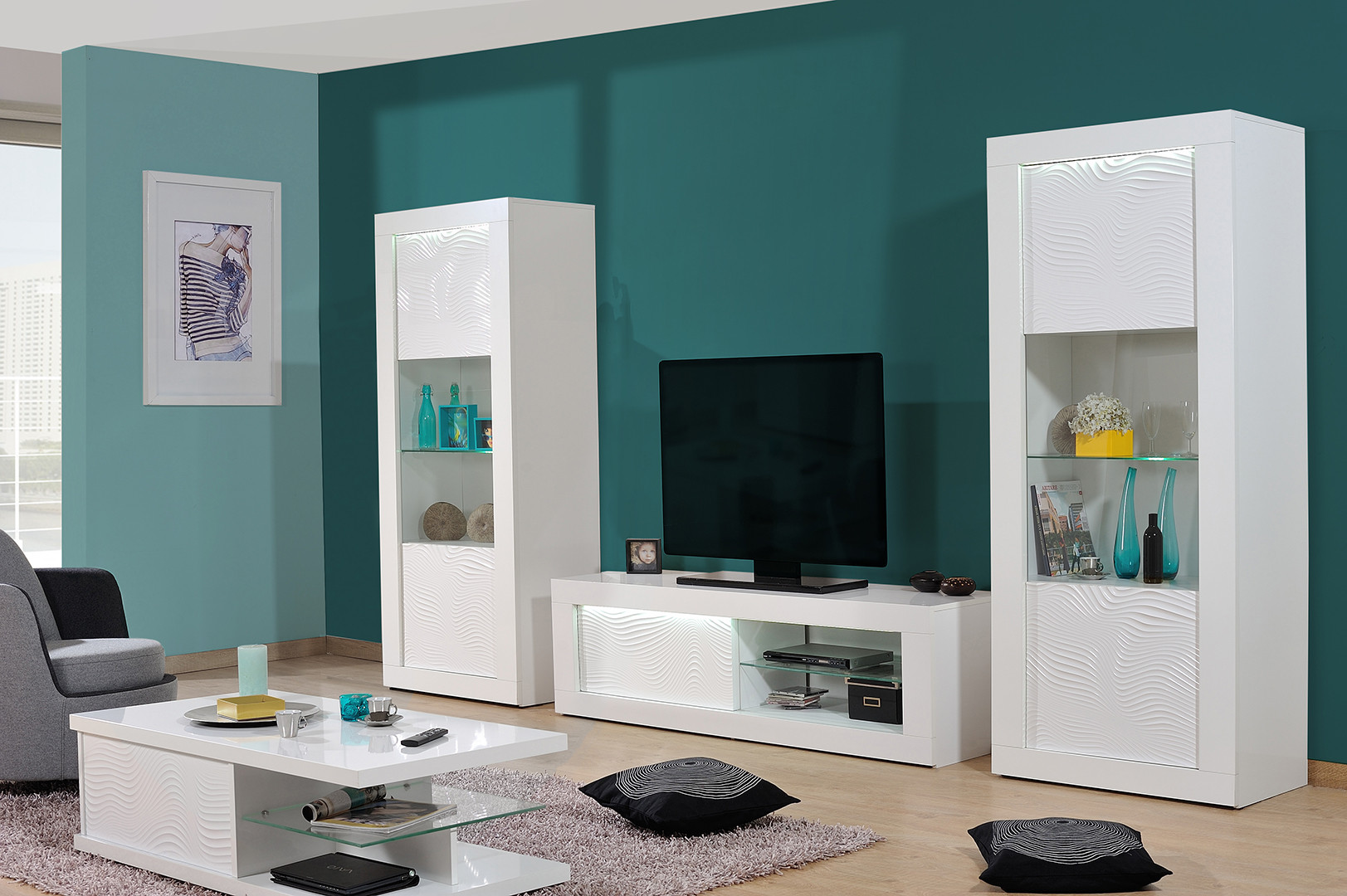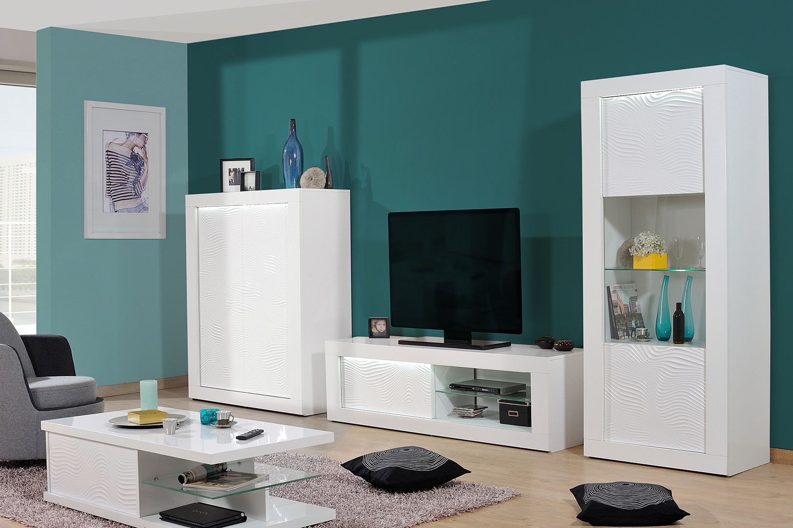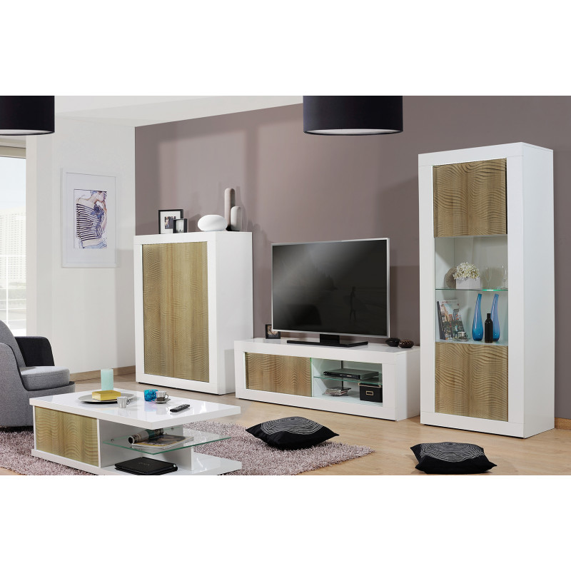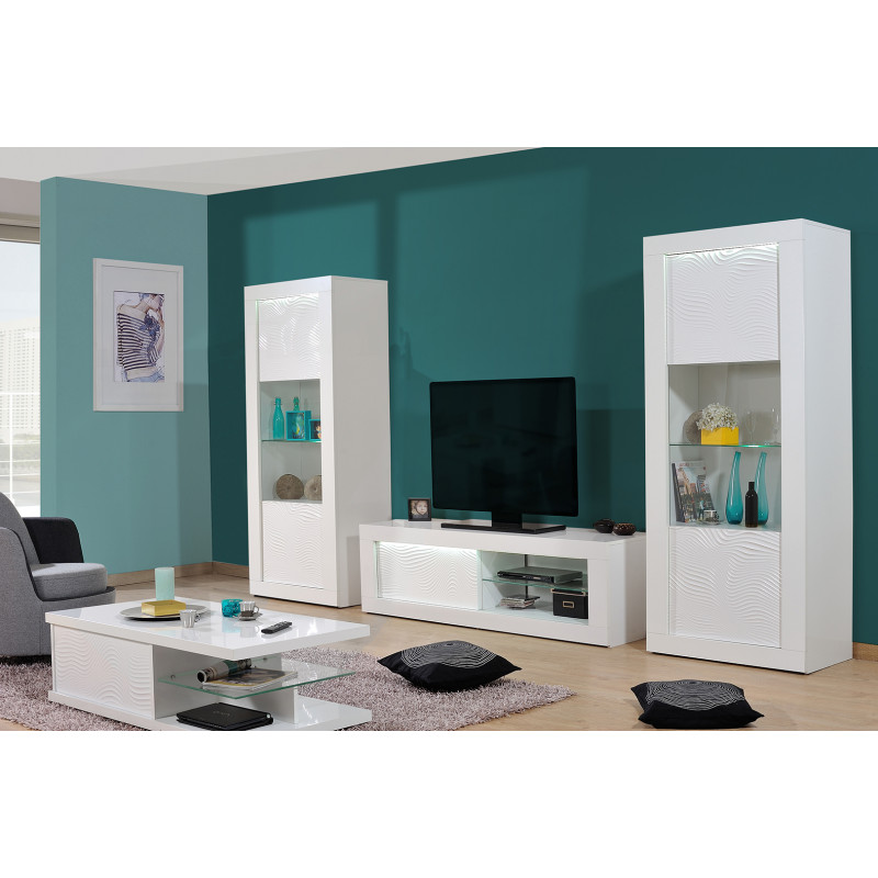| Structure | Panneaux de particule épaisseur 16 à 38 mm revêtus d'un décor blanc uni - extérieurs laqués blanc brillant - façades en MDF 22 mm |
